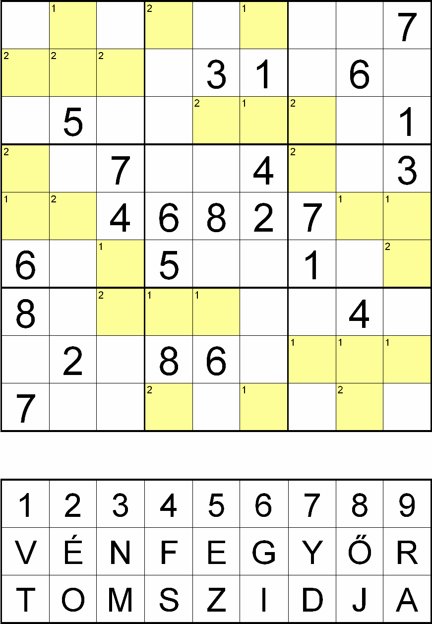 Miután megfejtette a rejtvényt, minden sárga mezőben, a fejtés során oda került szám helyére helyettesítsen be egy betűt a rejtvényábra alatti táblázatból! Ahol a kérdéses mező bal felső sarkában 1-es szám van, ott a VÉN FEGYŐR, ahol 2-es szám van, ott pedig a TOM SZIDJA sorából válassza a számhoz tartozó betűt! Ezek után az így behelyettesített betűket felülről lefelé, balról jobbra összeolvasva megkapja a rejtvény szöveges megfejtését.