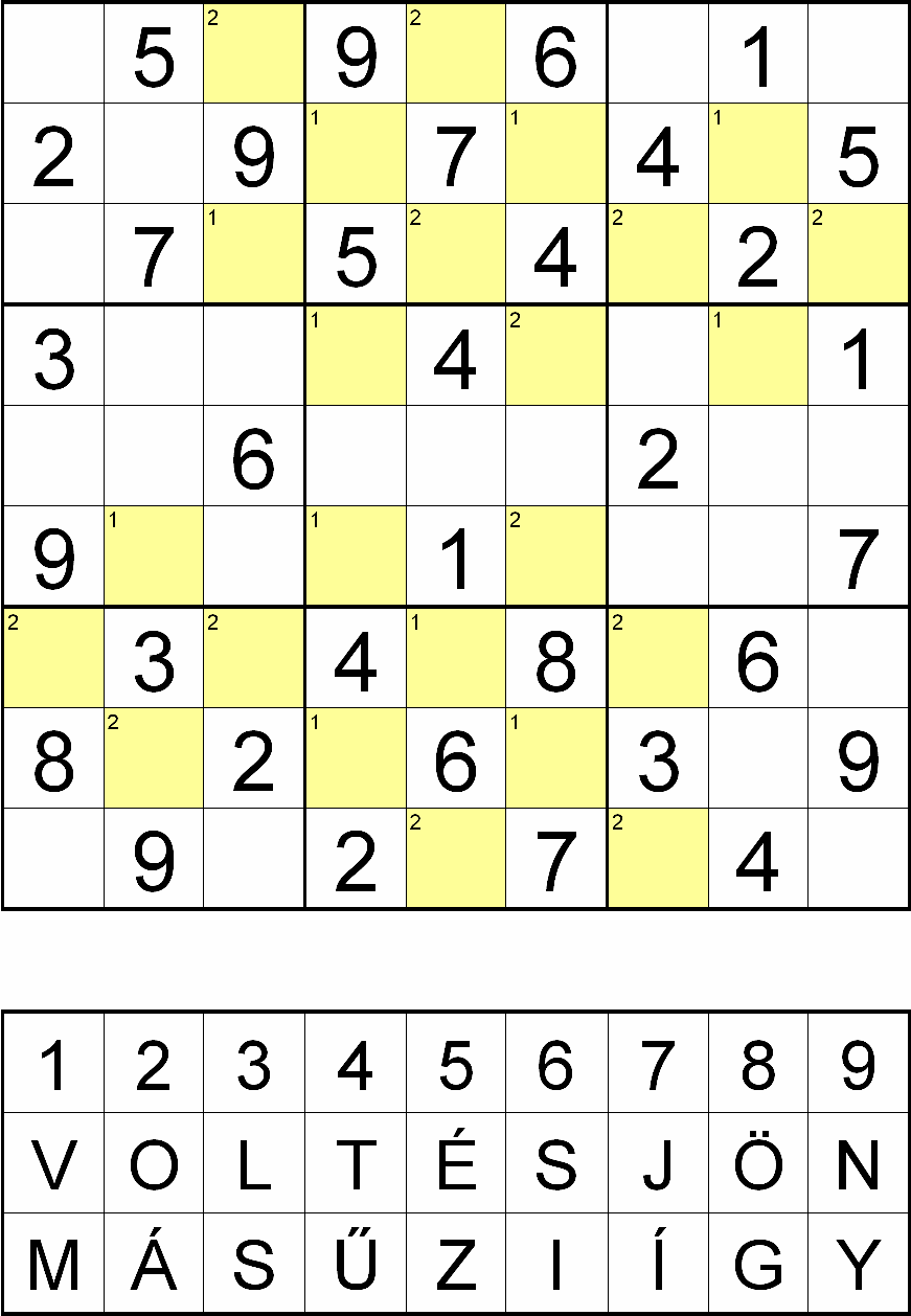 Miután megfejtette a rejtvényt, minden sárga mezőben, a fejtés során oda került szám helyére helyettesítsen be egy betűt a rejtvényábra alatti táblázatból! Ahol a kérdéses mező bal felső sarkában 1-es szám van, ott a VOLT ÉS JÖN, ahol pedig 2-es szám van, ott a MÁS ŰZI ÍGY betűsorból válassza a számhoz tartozó betűt! Ezek után az így behelyettesített betűket összeolvasva megkapja a rejtvény szöveges megfejtését.