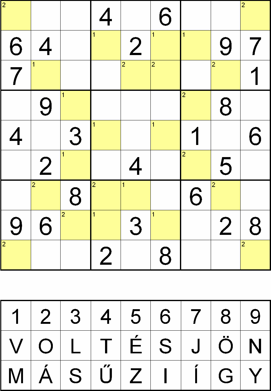 Miután megfejtette a rejtvényt, minden sárga mezőben, a fejtés során oda került szám helyére helyettesítsen be egy betűt a rejtvényábra alatti táblázatból! Ahol a kérdéses mező bal felső sarkában 1-es szám van, ott a VOLT ÉS JÖN, ahol pedig 2-es szám van, ott a MÁS ŰZI ÍGY betűsorból válassza a számhoz tartozó betűt! Ezek után az így behelyettesített betűket összeolvasva megkapja a rejtvény szöveges megfejtését.