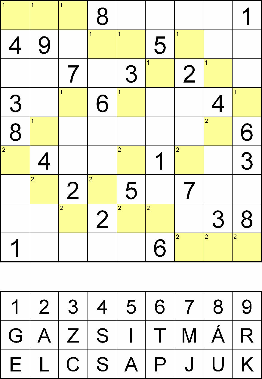 Miután megfejtette a rejtvényt, minden sárga mezőben, a fejtés során oda került szám helyére helyettesítsen be egy betűt a rejtvényábra alatti táblázatból! Ahol a kérdéses mező bal felső sarkában 1-es szám van, ott a „GAZSIT MÁR”, ahol 2-es szám van, ott pedig az „ELCSAPJUK” betűsorból válassza a számhoz tartozó betűt!