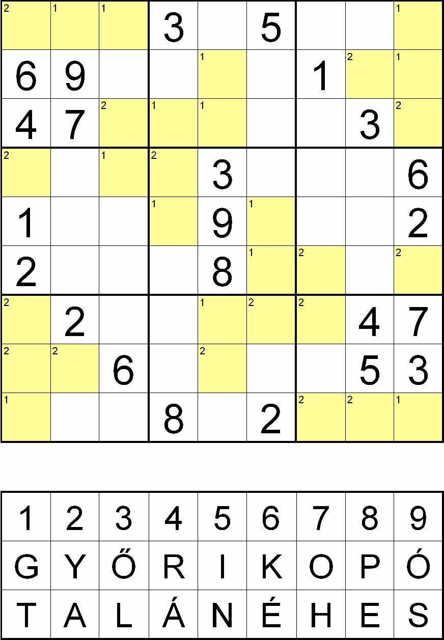 Miután megfejtette a rejtvényt, minden sárga mezőben, a fejtés során oda került szám helyére helyettesítsen be egy betűt a rejtvényábra alatti táblázatból! Ahol a kérdéses mező bal felső sarkában 1-es szám van, ott a GYŐRI KOPÓ, ahol 2-es szám van, ott pedig a TALÁN ÉHES betűsorból válassza a számhoz tartozó betűt! Ezek után az így behelyettesített betűket összeolvasva megkapja a rejtvény szöveges megfejtését.