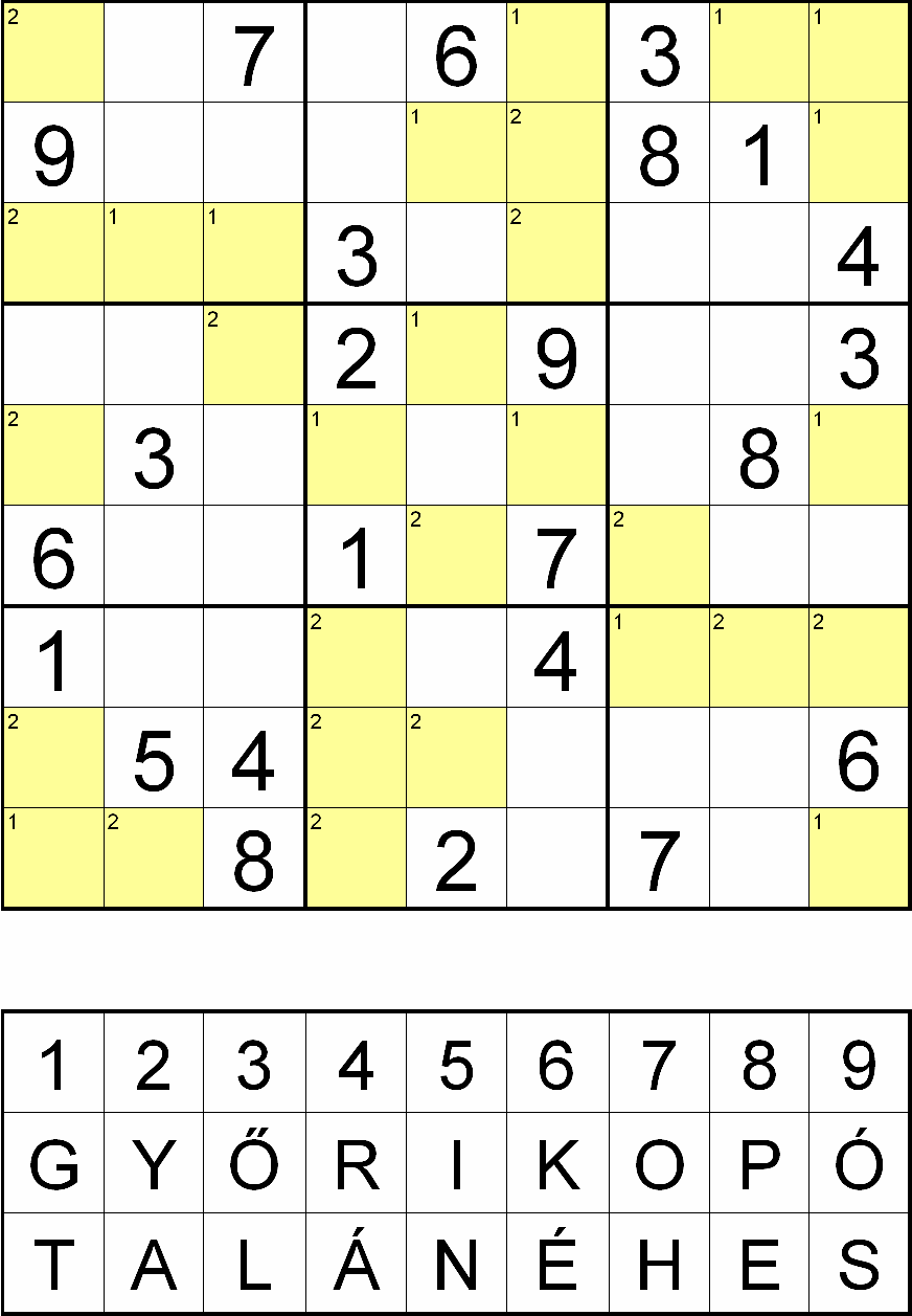 Miután megfejtette a rejtvényt, minden sárga mezőben, a fejtés során oda került szám helyére helyettesítsen be egy betűt a rejtvényábra alatti táblázatból! Ahol a kérdéses mező bal felső sarkában 1-es szám van, ott a GYŐRI KOPÓ, ahol 2-es szám van, ott pedig a TALÁN ÉHES betűsorból válassza a számhoz tartozó betűt! Ezek után az így behelyettesített betűket összeolvasva megkapja a rejtvény szöveges megfejtését.