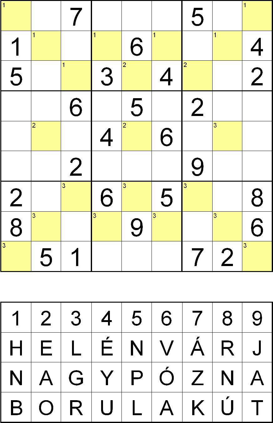 A rejtvény megfejtését követően – az ábra alatti kis táblázatból – minden sárga szegélyű mezőben lévő szám helyére a szövegből, ahol a mező bal felső sarkában 1-es van, ott a „HELÉN, VÁRJ”, ahol 2-es van, ott a „NAGY PÓZNA” ahol 3-as van, ott pedig a „BORUL A KÚT” sorból írja be azt a betűt, amely felett a kérdéses számot találja!