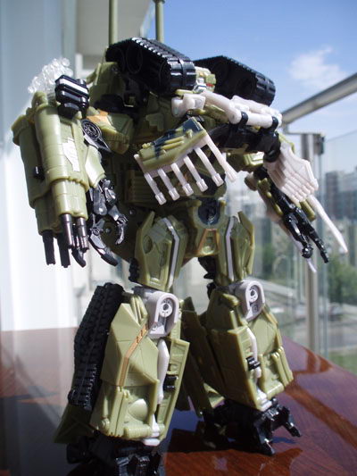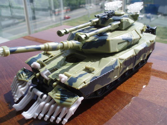 Rendkívül robosztus figuráról beszélünk. Az alt mód egy amerikai M1 Abrahams tank, melyet rendkívül élethûen sikerült elkészíteni. A festése gyönyörû és a méretei, a rajta található összesen hét fegyver, valamint az elején található aknaszedõ / gallytörõ villák miatt igen zord külseje van. Egyedül a gránátvetõk áttetszõ kivitele nem tetszik, nem tudom, hogy miért van így, de jobb lenne ezeknek is a terepszínû festés. A figura nagyjából méretarányos a deluxe, voyager (Jazz, Ratchet) autó méretskálával.