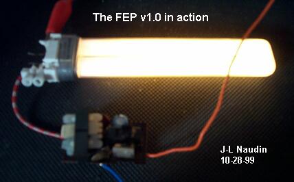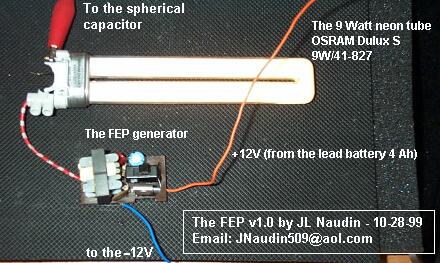 A FEP v1.0 egy gömbölyű kapacitást használ amely egy üreges alumínium gömb ( 356mm az átmérő és 240mm a magaság) Egy 9W-os neon cső (OSRAM 9W/Delux S41/82) került csatlakoztatásra a FEP generátor és az aluminium gömb közé.
