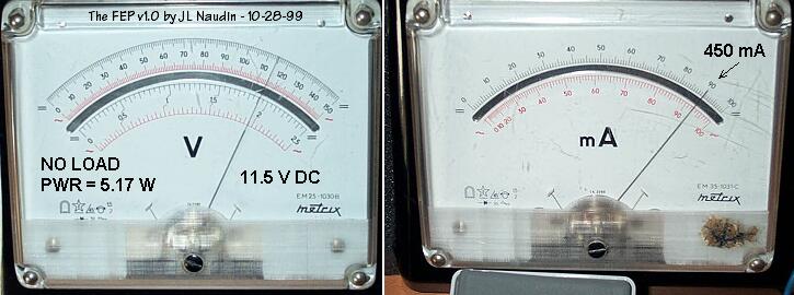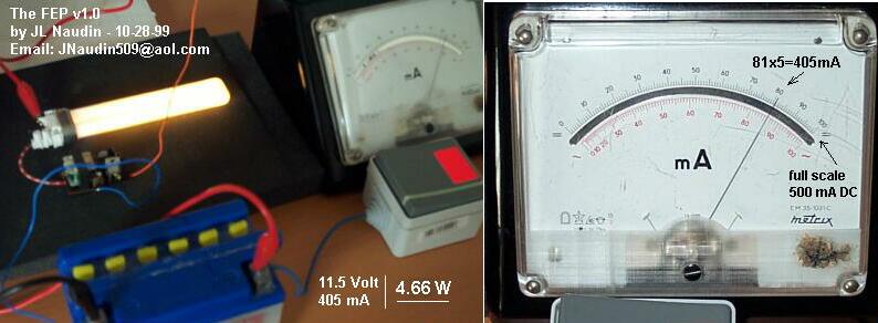Így, amikor a bekapcsoltam a készüléket neoncső nélkül (a FEP kimenetének nyitva hagyásásval), a FEP áramkör működéséhez szükséges energia input 5.17Watt ( 11.5Volt és 450mA DC ) volt (amit a következő ábrán meg is nézhetsz).