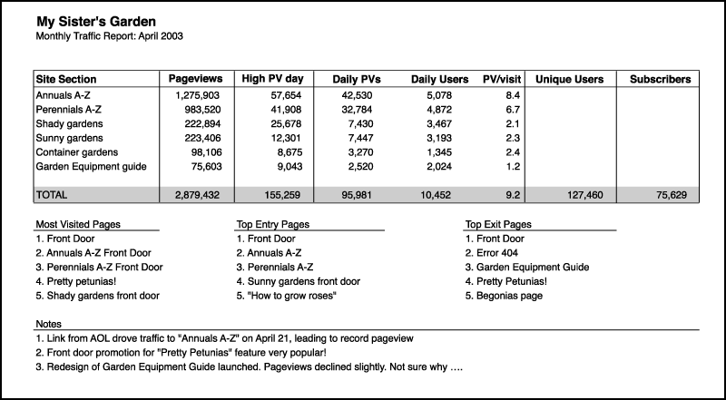 Traffic reports are as unique as the sites they monitor. The structure of your report will mimic the structure of your site. And the metrics you track will depend on what matters most to your site and your business. Below is a sample report to get you started.