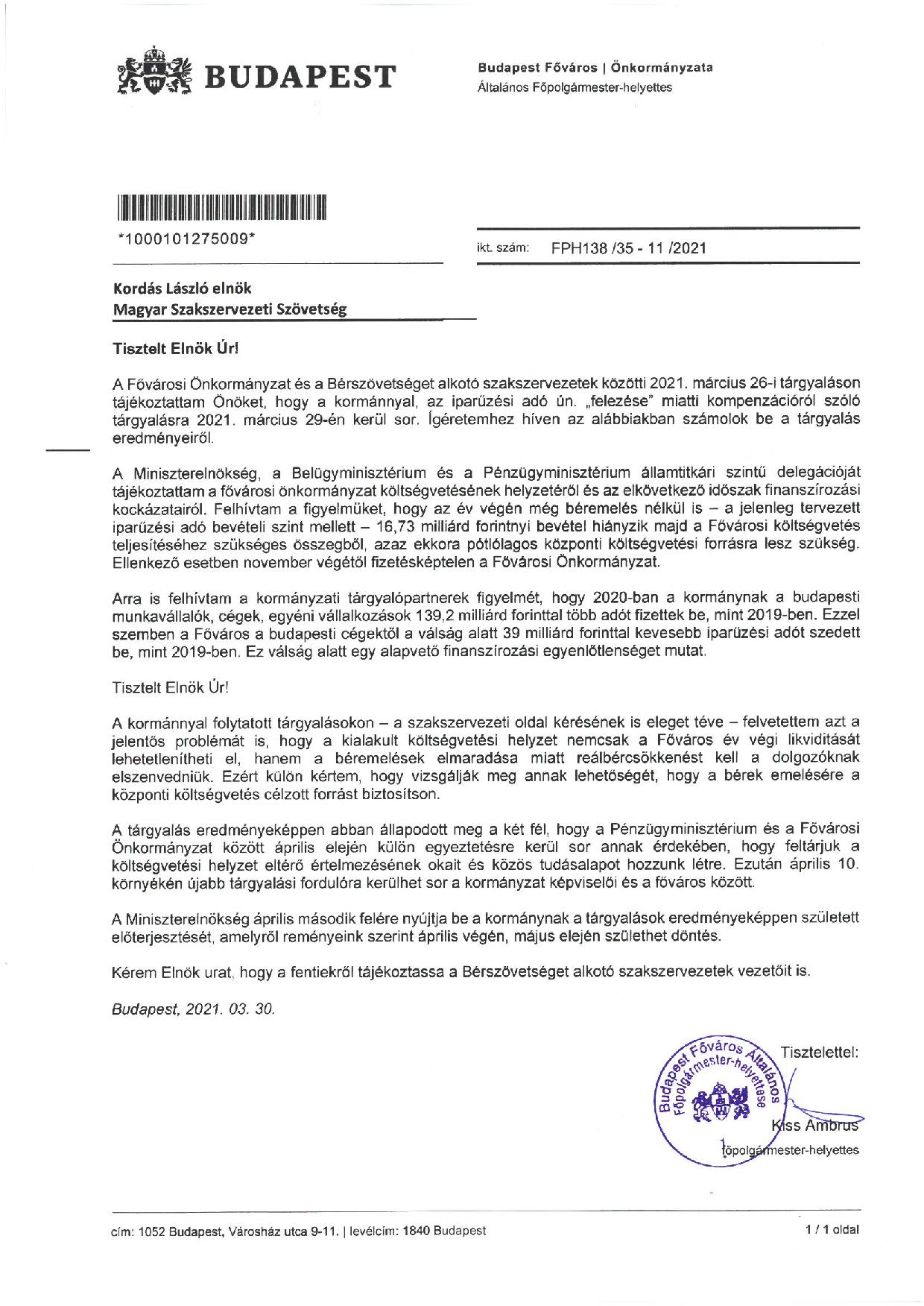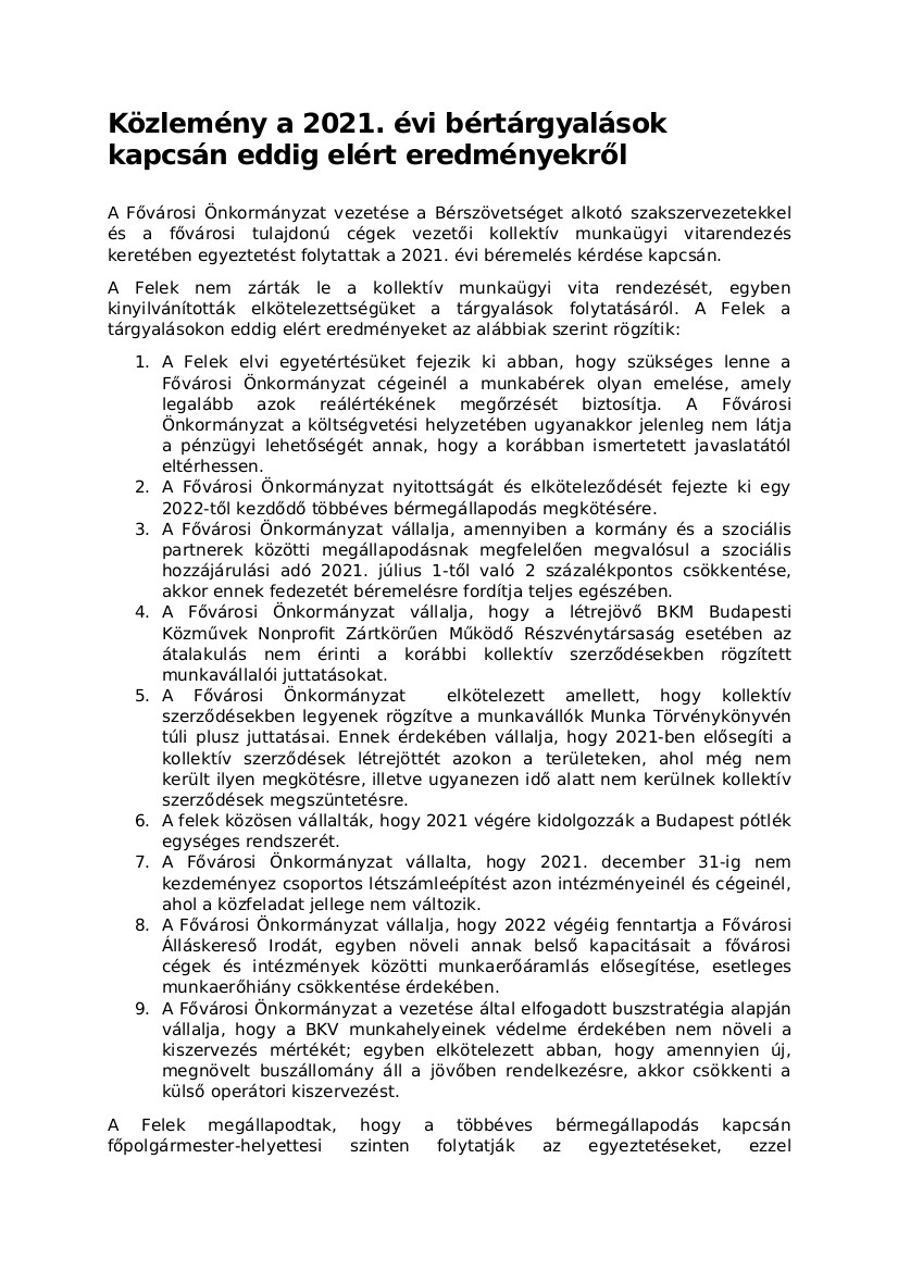 A Bérszövetséget alkotó és kollektív munkaügyi vitát kezdeményező szakszervezetek képviselői március 23-án levelet kaptak Kiss Ambrus főpolgármester-helyettestől, amelyben tárgyalásra hívja őket március 26-ra, az érintett fővárosi tulajdonú társaságok vezetőivel együtt.