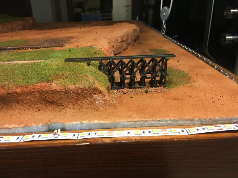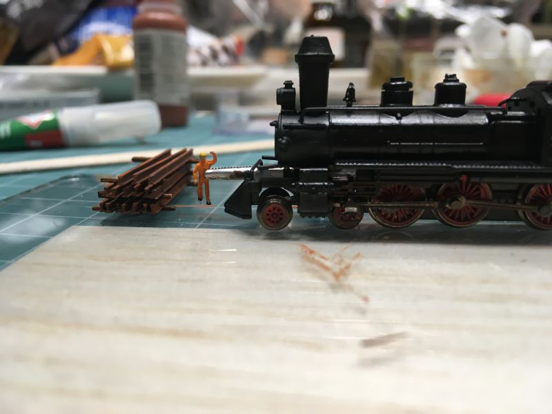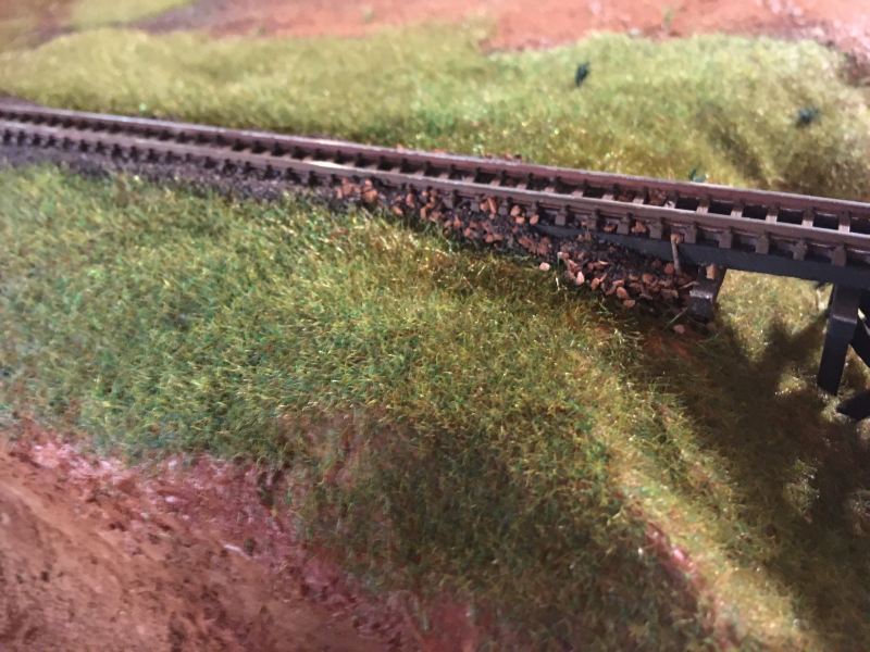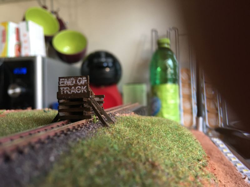 A fű sztatikus szórással készült, így a fűszálak tényleg szépen állnak. Ami nehezebb volt, hogy a sínek között is legyen fű.