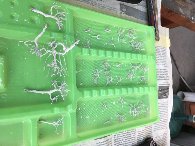 Minden egyes fát, bokrot egyenként kellett elkészíteni. Először készítettem egy drót vázat, azt lekentem fatapasszal,
