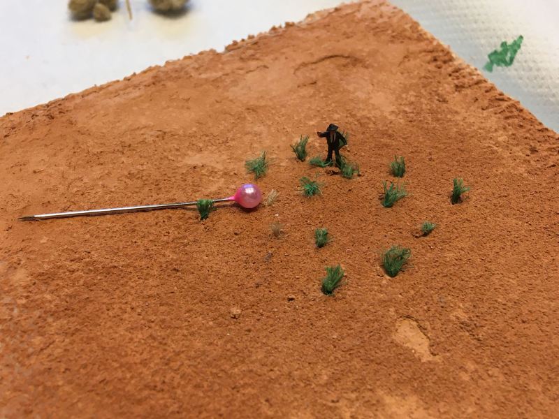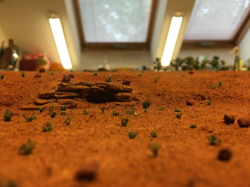 A vörös sivatagos felületet úgy értem el, hogy faragasztóval lekentem egy kis részt és azt leszórtam finom szitán átszűrt téglaporral. Amikor