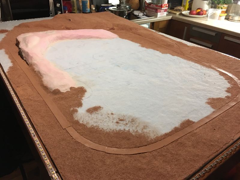 A domborzat éleinek eltűntetéséhez kabátbélés anyagot használtam, amit faragasztóval rögzítettem. Ezzel tulajdonképen az egész terepasztalt beborítottam, mert