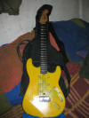 Az interneten nem találtam semmit erről a márkáról, de állítólag NSZK hagyaték. Amikor szétcsavaroztam, kiderült, hogy a fekete test valójában fehér volt, és hogy az előlap eredetileg 3 single coil pickup-hoz készült. A nyakmerevítőt a test felől lehet állítani, a testen viszont nincs meg a bemarás, ami ezt lehetővé teszi, tehát a két testrész nem egyszerre indult útnak. Az egészet jól ki kellett takarítani. Minden csavart kicseréltem, mert ette a rozsda őket. Úgy gondoltam, vagányabb lesz a cuccos, ha sárga színben fog tündökölni. |