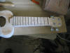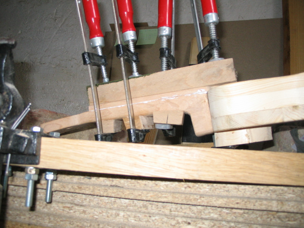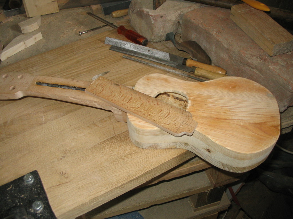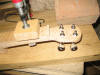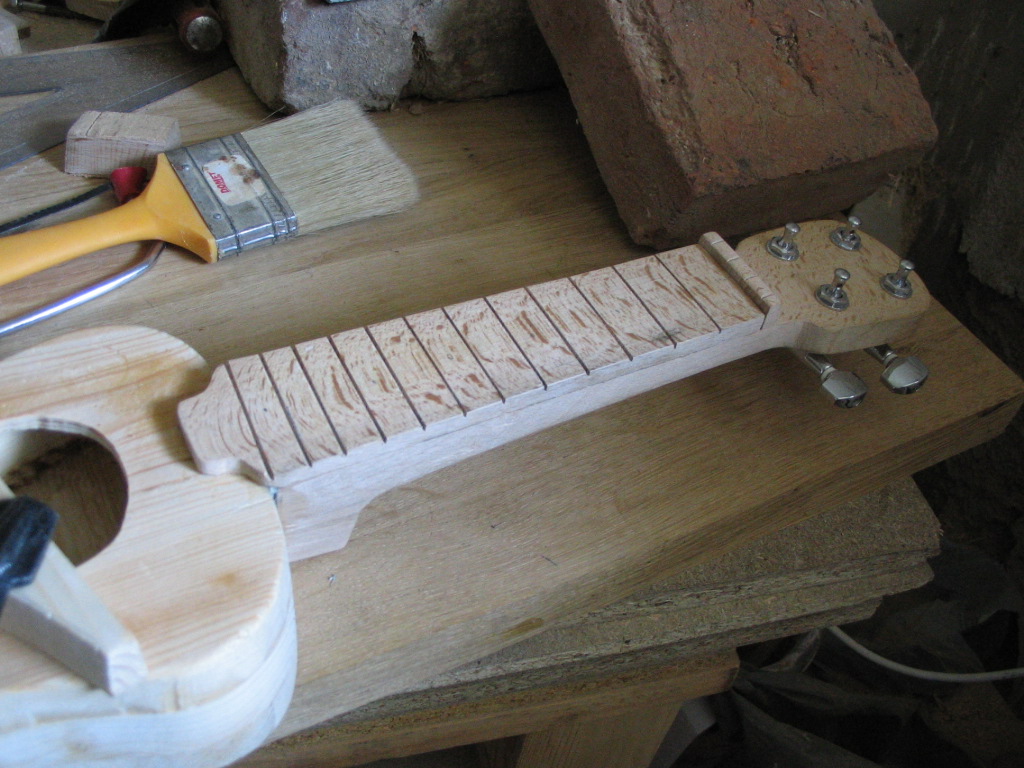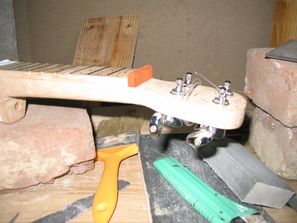 A fogólap elkészülte után megint csavartam egyet a technikán. Eszköz híján nem tudtam stabil helyzetben tartani az aprócska fadarabot, ezért ráragasztottam a nyakra, és ezután bundoztam meg. A fogólap felhelyezése után helyére került a nut is, szintén ugyanabból a bükkfából. Finom mozdulatokkal kellett csiszolni, mert igen pici darab. Mikor megragadt, kimértem és háromszög keresztmetszetű reszelővel vájatokat készítettem a húroknak. |