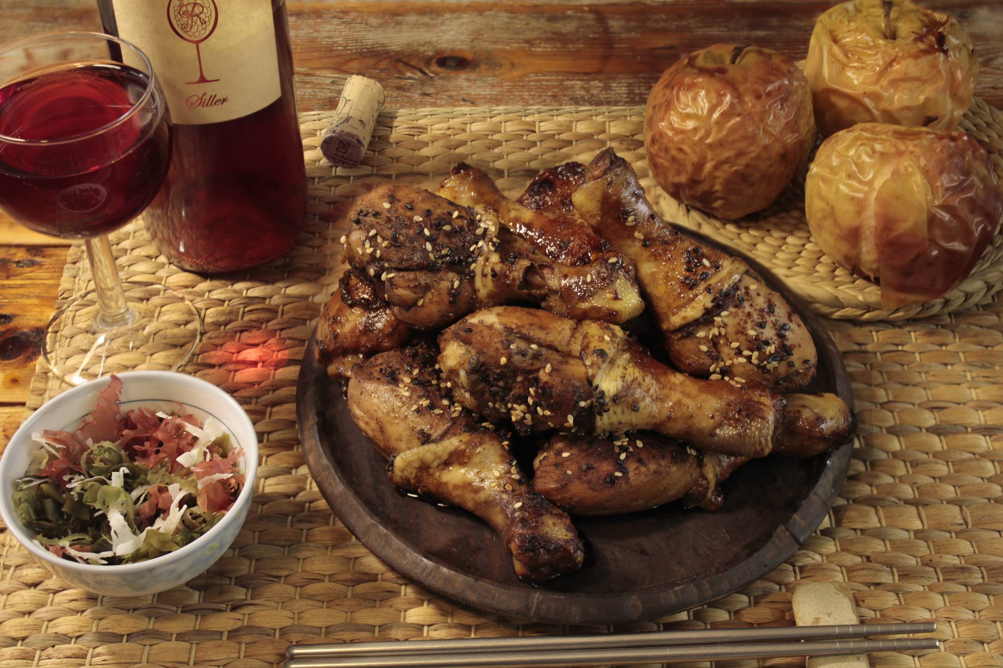 Grill csirke felsőcomb , sült almával és alga saláta - egy pohár Siller borral René Juhász borászatából. Grilled chicken thighs, with baked apple and seaweed salad. After a glass of wine Siller from René's Wine Heaven . Food & Wine , Food , Wine Spectator , photo by: gábor haszon © |