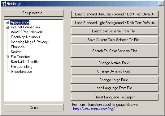 A földrészek kiválasztása a WinMX központi szervereihez való csatlakozás meghatározását segíti elő.