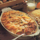 Tejszínt adunk a léhez és felforraljuk. Hozzáadjuk a karikára vágott burgonyát és 5 percig főzzük. A burgonya felét szitával kivesszük, és tűzálló tálba rakjuk. Ráteszünk egy sor gombát és a burgonya másik felét. Felverjük a tojást. A levet apránként hozzákeverjük, és petrezselyemet adunk hozzá. Megfűszerezzük és a burgonyára öntjük, majd megszorjuk reszelt sajttal, aranybarnára sütjük. Fontos , hogy ne rakjuk tele a tálat, mert kifuthat. Használjuk inkább két edényt. Frissen a legfinomabb.